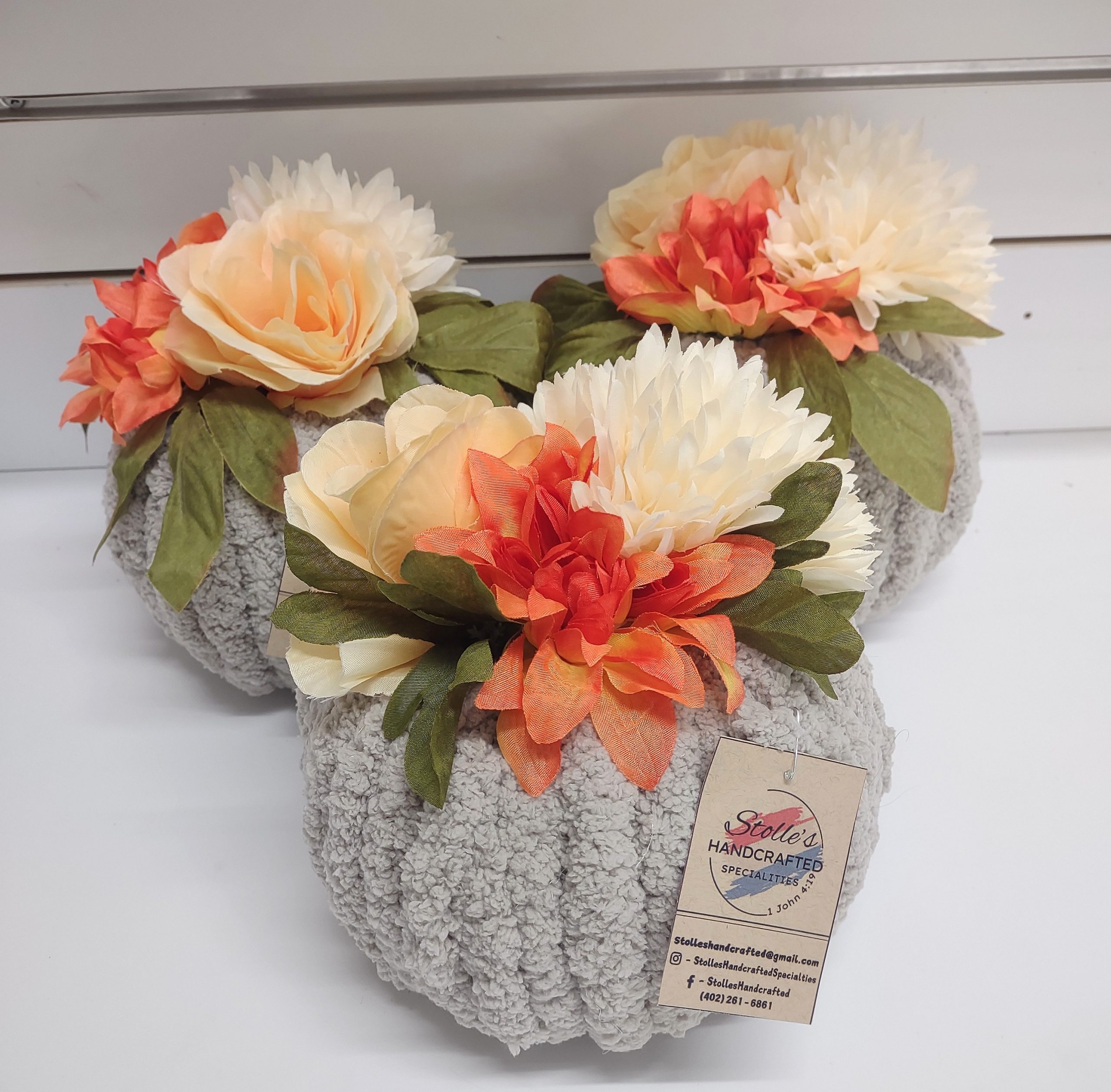 This floral yarn pumpkin was handcrafted by one of the talented members of Stolle’s Handcrafted Specialties! Interested in more like this? Email us HERE!