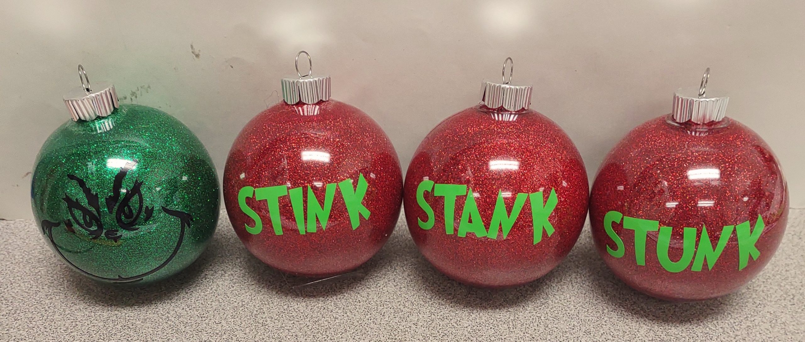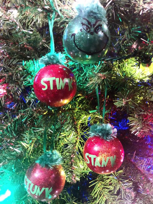 This ornament set includes 1 Grinch and 3 red ornaments that say “Stink”, “Stank”, “Stunk”.  Great way to adorn your tree or to give as a gift!