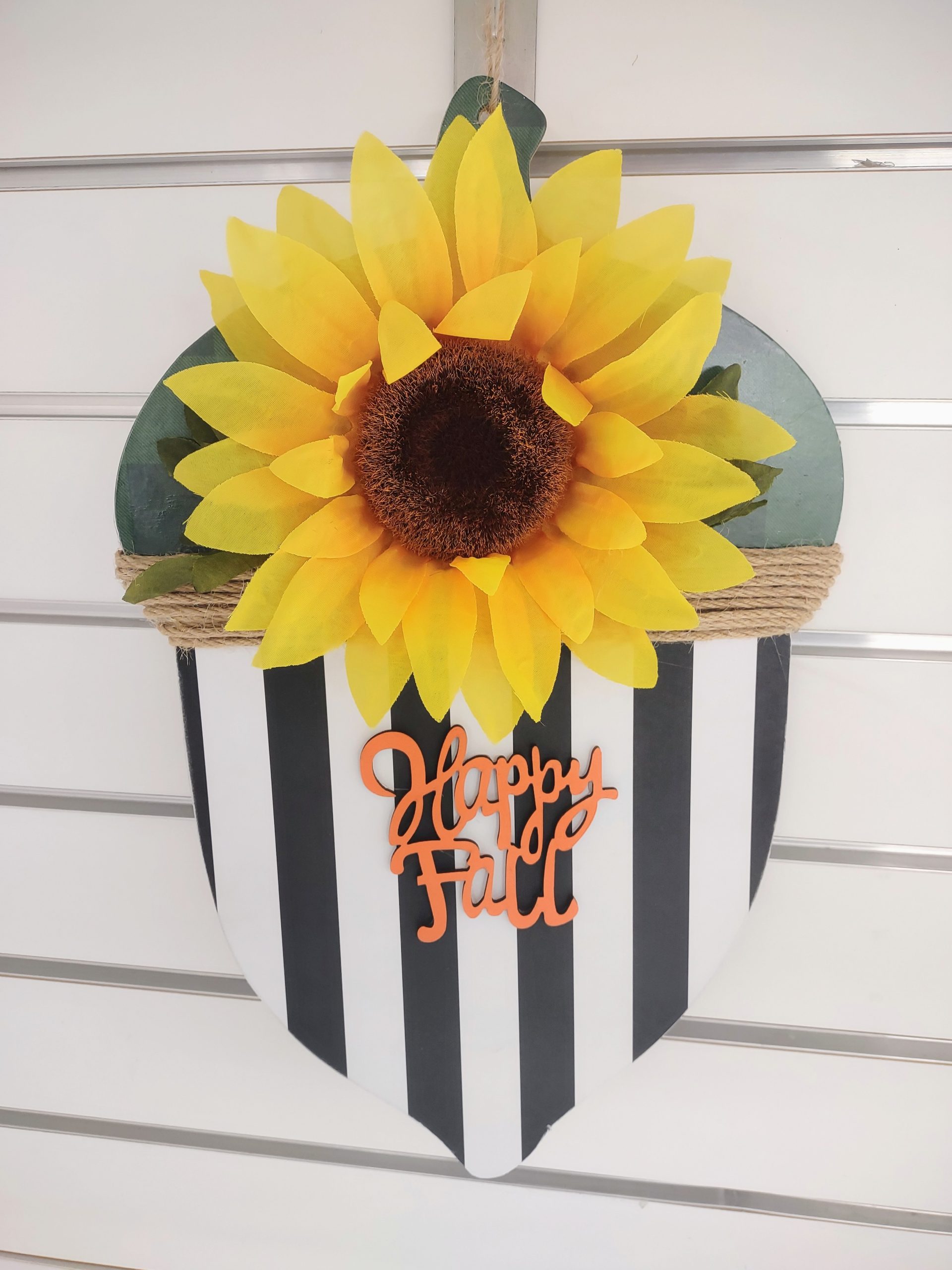 This adorable black and white striped sunflower acorn wall hanging is a great addition to your fall decor. Perfect for your door or to adorn any wall! The Striped Sunflower Acorn wall hanging measures about 12″ tall and 7″ across. Celebrate fall with our unique Striped Sunflower Wall Hanging!